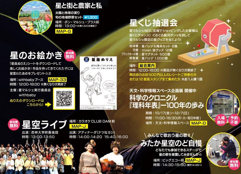 最新人工衛星製造に関わったリーマンサット武井さとしさんx宇宙塾塾長和田直樹さんのスペシャルトークイベント・国立天文台名誉教授の立松健一さんをゲストに迎える星酒場『「黄道12星座」って何?誕生星座を科学する』(事前予約制)・西洋占星術、見逃せないイベント続々。『星と街と農家と私』ブースでは毎年争奪戦の季節の地場野菜セット販売。GETできた人はラッキー!とても人気でお得な詰め合わせです。