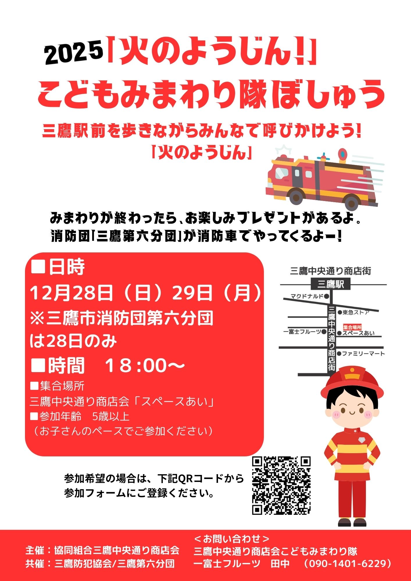 今年も三鷹第六消防団の皆さんが来てくれます。(12/28のみ。12/29は夜警を行いますが消防車は来ません。)