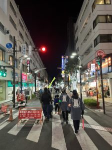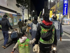 ルートはいくつかあり、都度拠点のスペースあいに戻って温かい飲み物を飲みながら身体を温め、しばし休憩。再度出発して別ルートを夜警、を数回繰り返します。全部参加しなくても構いません。